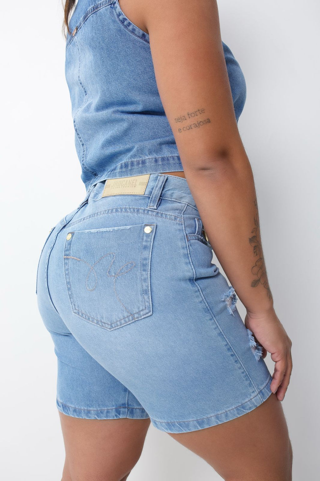 Características: Bermuda feminina jeans meia coxa com detalhes de puídos frente, cós com passantes, fechamento com botões e zíper .